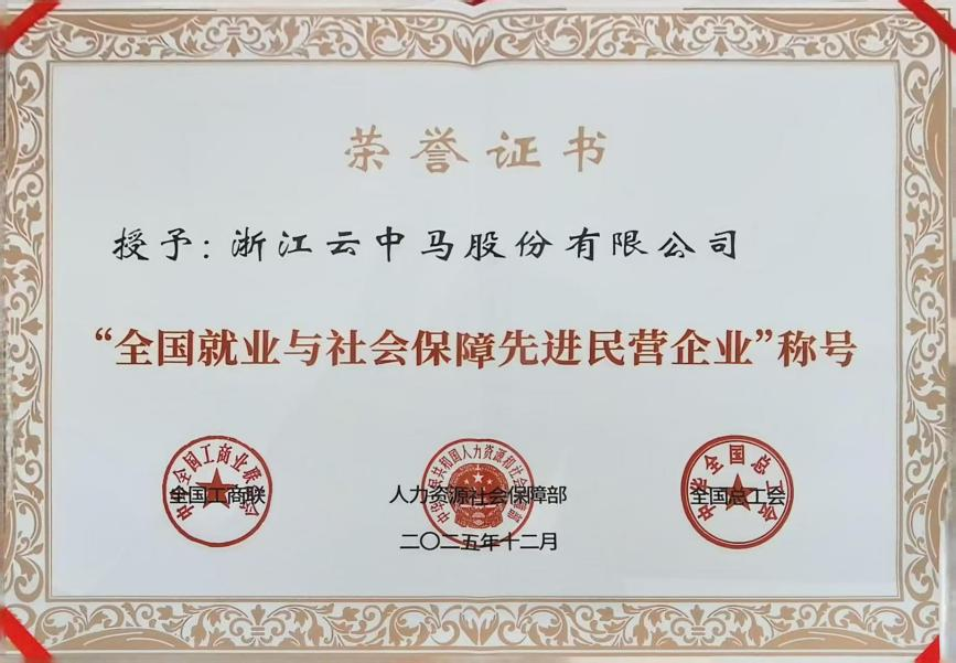 近日,由中華全國工商業聯合會、人力資源和社會保障部、中華全國總工會聯合印發的《關于表彰全國就業與社會保障先進民營企業等先進典型的決定》(全聯發〔2025〕21 號)正式公布,浙江云中馬股份有限公司憑借在穩定就業、完善社保體系、構建和諧勞動關系等方面的突出貢獻,榮獲 “全國就業與社會保障先進民營企業”稱號!這一國家級榮譽,不僅是對云中馬踐行 “以員工為本” 理念的肯定,更是對其作為制造業民企 “穩就業、保民生” 社會責任的生動注解。